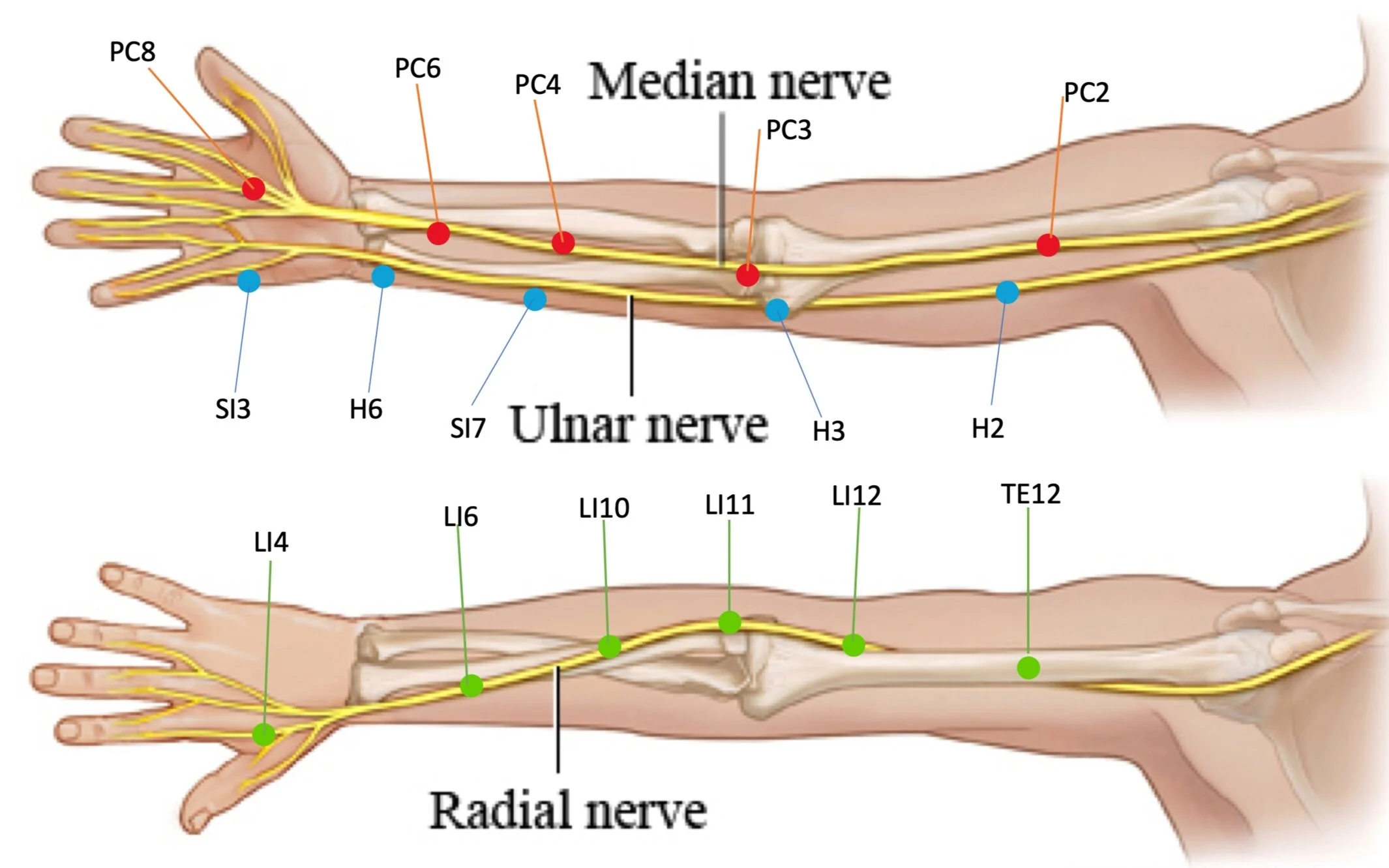 Tyypillisiä yläraajan akupunktiopisteitä, jotka asettuvat hermojen kulkureiteille.