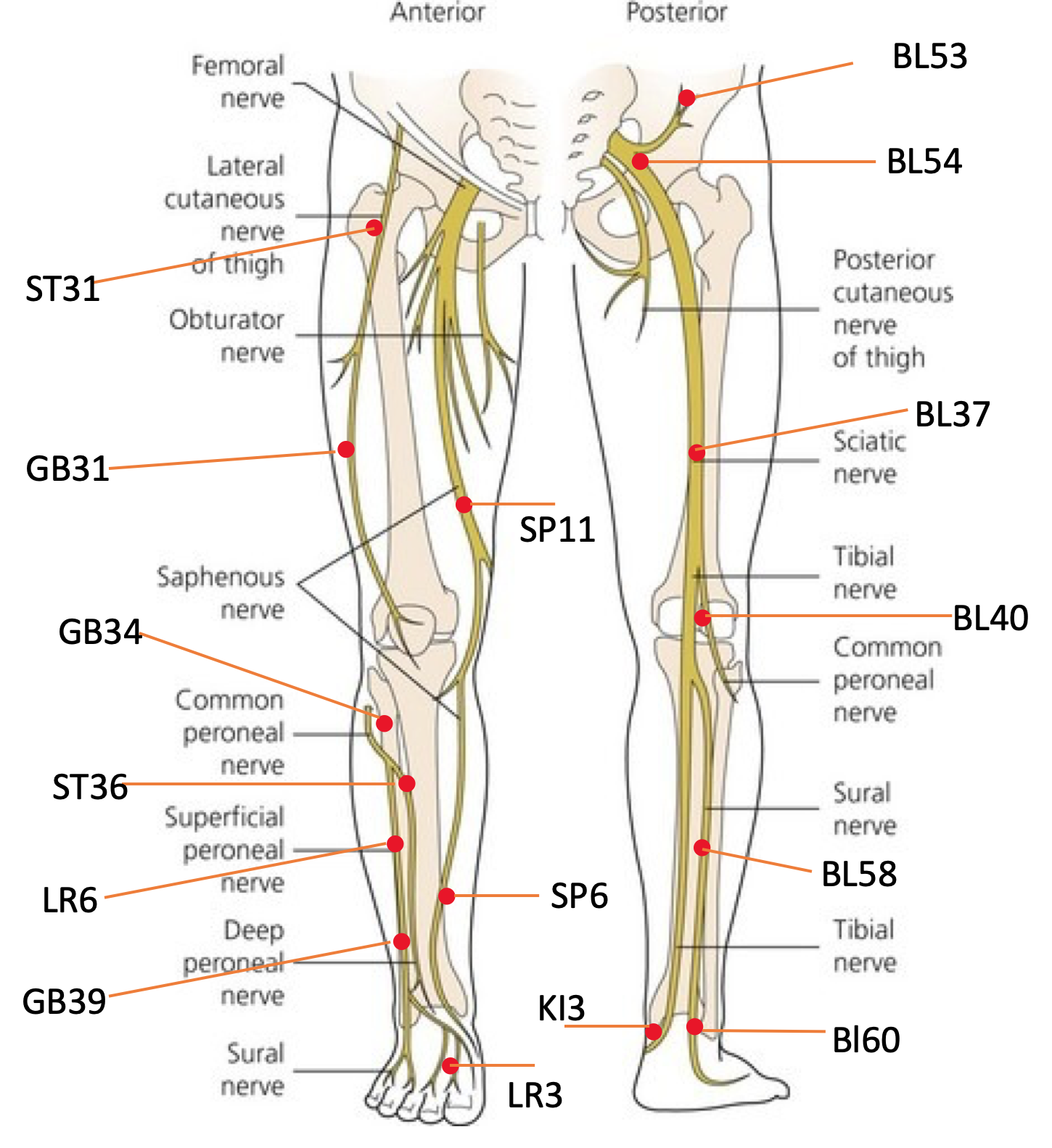 Tyypillisiä alaraajan akupunktiopisteitä, jotka asettuvat hermojen kulkureiteille.